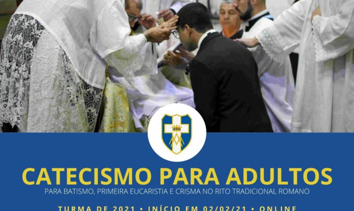 Para adultos e jovens a partir de 13 anos, a Congregação Mariana mantém desde o seu início, em 2013, turmas de Catecismo para adultos, com duração média de um ano, para a recepção do Batismo, da Primeira Comunhão e da Crisma, sempre no Rito Tradicional Romano, e também para o estudo e aprofundamento nas bases de nossa fé. O catecismo na turma de 2024 será dado às quintas-feiras, 19h30, com início em 08/08/24, na modalidade online.